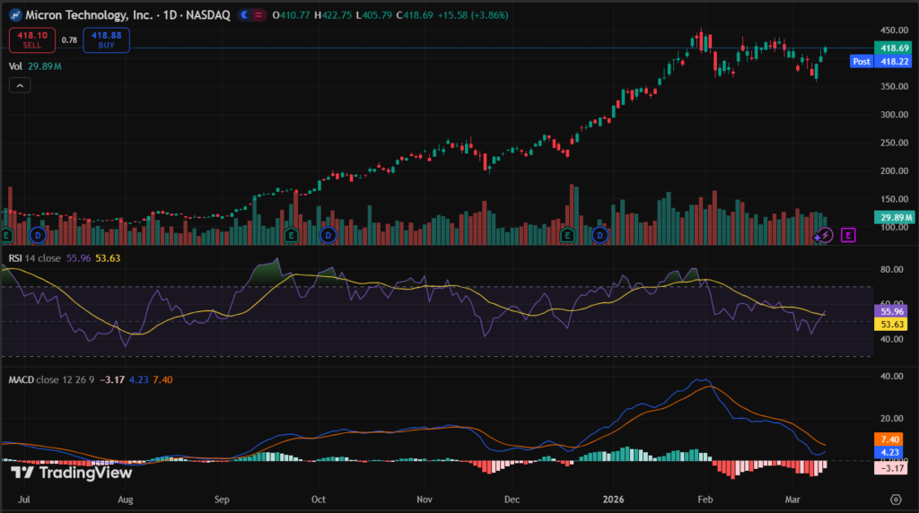 Trading volume spiked to 35M shares daily. Heavy volume validates MU technical analysis conviction.