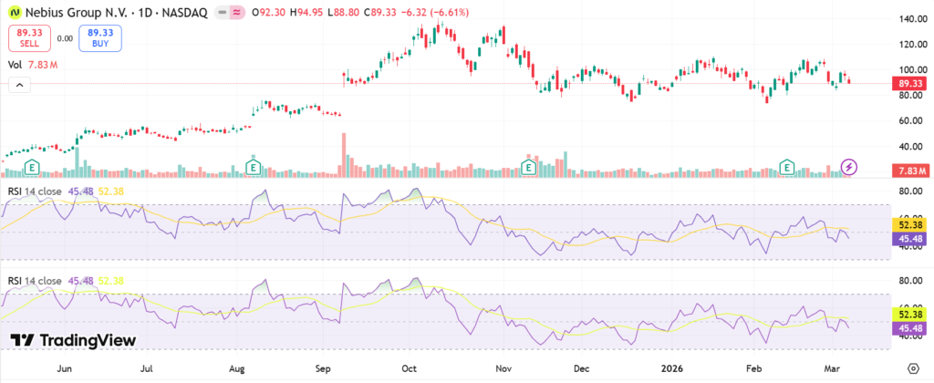 As of the last market close on March 6, 2026, NBIS stock price stands at $89.33, down 6.61% for the day. The 1-day performance showed a drop from $95.65 amid selling pressure. Over five days, it declined sharply from recent highs around $97.