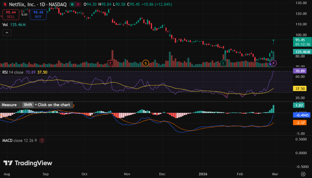 NFLX stock closed at $94.97 on February 27, 2026, up from a previous close around $84-$85 amid recent gains. The stock saw a 1-day gain of about 12% from its intraday low of $84.80, reflecting positive momentum from deal news.
