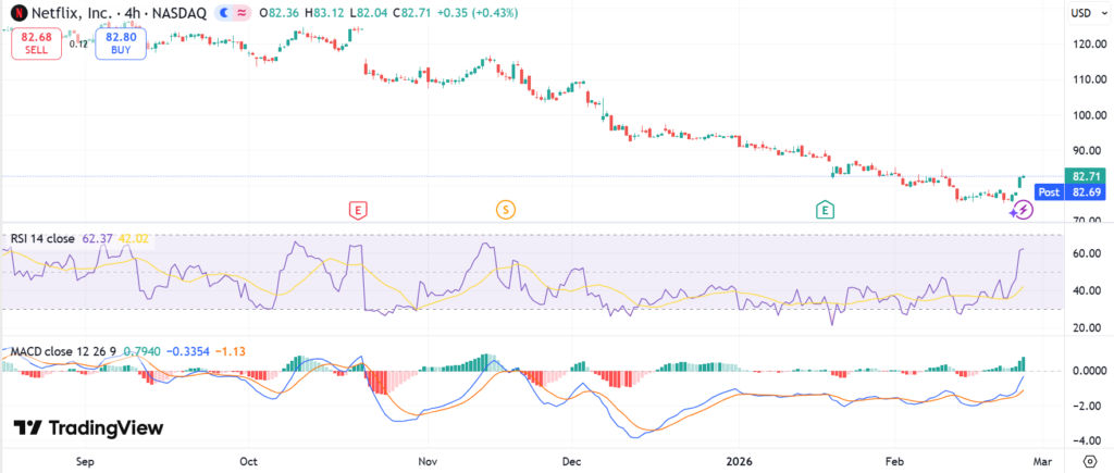 NFLX stock closed at $82.85 on February 25, 2026. It ranged $79.35-$83.12, up from $78.04 prior close.