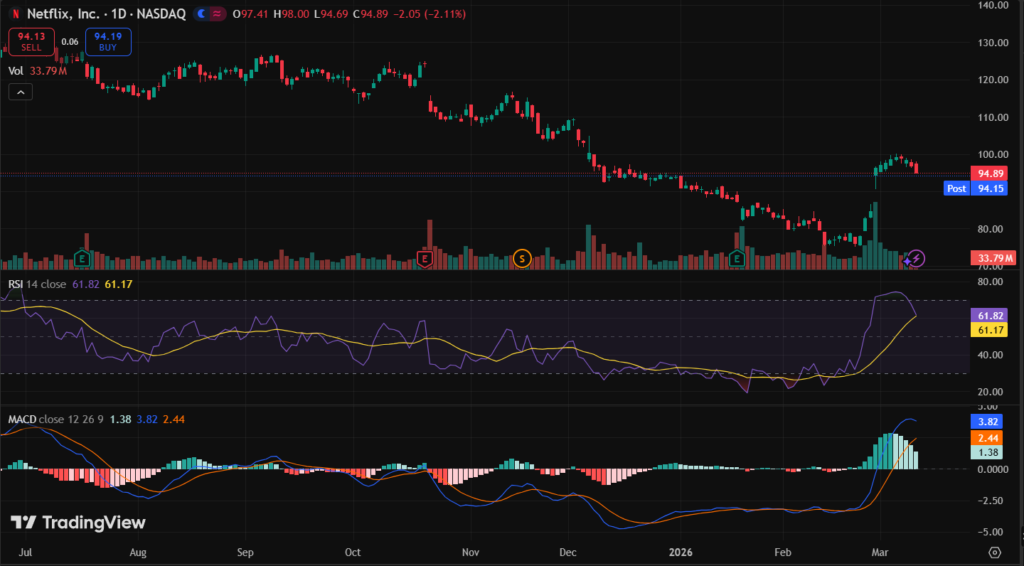 NFLX stock closed at $96.94 on March 10, 2026 (last market close data). It fell from $97.81 open. Five-day trend mixed around $97-99 range.