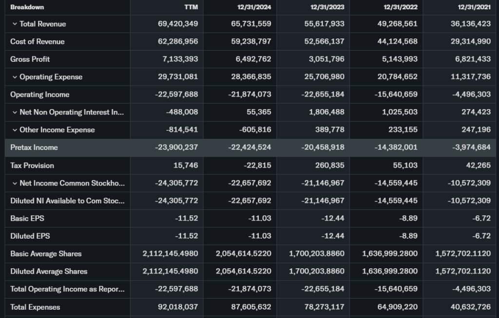 Revenue grew 47% YoY to $12.78 billion in 2025. EPS improved but still negative at -$0.21 last quarter. Free cash flow lags from capex, offset by $6 billion cash pile against debt.