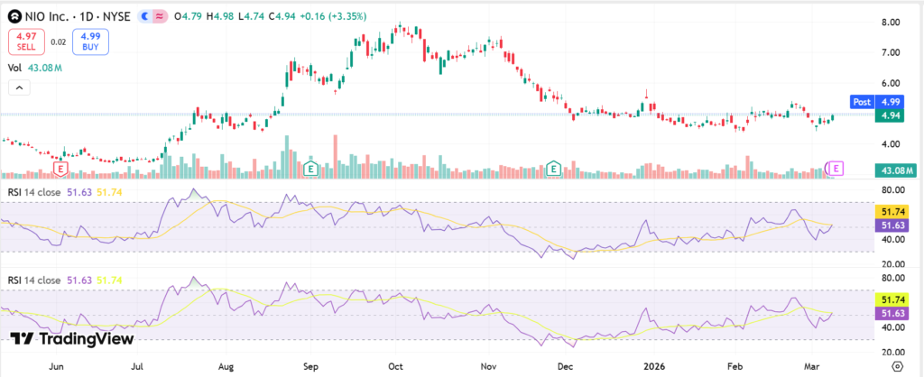Year-to-date in 2026, NIO stock is down over 20%, with a 52-week range of $3.02 low to $8.02 high.​