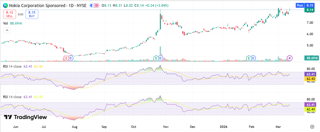 Year-to-date in 2026, NOK stock surged 53.40% from 52-week low of $4.00. The 52-week high stands at $8.37, with current price 5.62% below it. Overall trend looks bullish, signaling investor confidence in Nokia’s turnaround for steady gains.