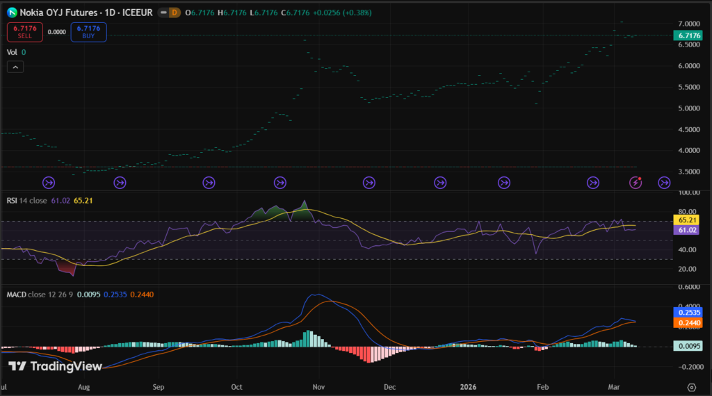 NOK stock traded at $7.77 on March 5, 2026 per market data, down 4.66% from $8.15 prior close. Day range $7.77-$7.98 on 22.9M shares.