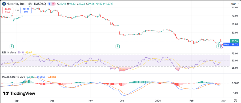 RSI reads 38.3, neutral but nearing oversold below 30. This momentum oscillator flags if NTNX stock overheats. MACD stays bearish with the line below signal, hinting at more downside.