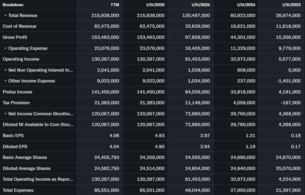 Revenue grew 73% YoY to $68B in Q4 2026; EPS $1.76 up big.[code_file:NVDA_quarter_income_statement_0fb110.csv] Free cash flow strong at $97B FY2026.