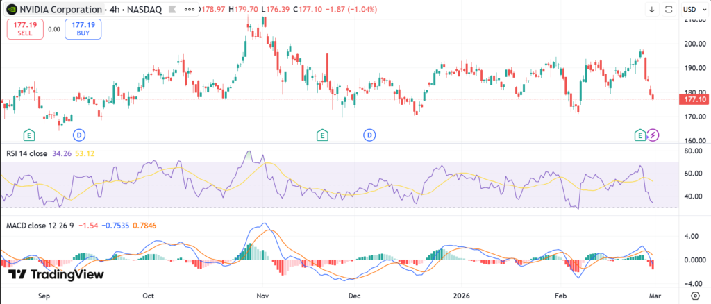The Relative Strength Index (RSI) for NVDA is currently in the mid‑30s, which is considered neutral to slightly oversold; it suggests that NVDA stock is not overbought and may have room to bounce if positive news or AI‑capex optimism returns. A reading below 30 typically signals oversold, while above 70 is overbought; being in the mid‑30s means momentum is weak but not yet oversold.