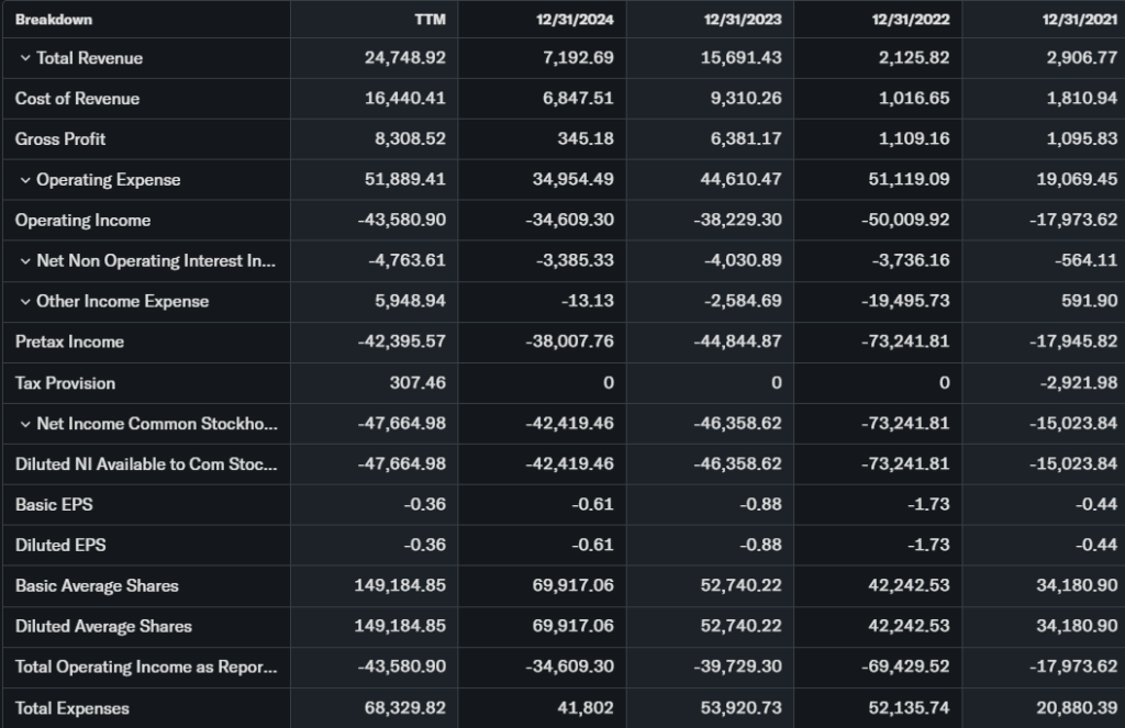 The price‑to‑sales (P/S) multiple is high, reflecting rapid growth expectations and the speculative nature of the name. On a trailing‑12‑month basis, revenue is roughly $24.75 million, up over 200% versus the prior year, largely driven by defense and drone contracts.