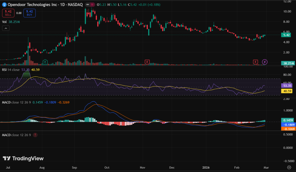 OPEN stock price $5.42 up 0.18%, volatile YTD -43% rebound. Q4 rev $736M miss, EPS -$1.26. Is OPEN stock a buy? Targets $3 avg, RSI 76 overbought. Forecast FY26 loss -$0.31.