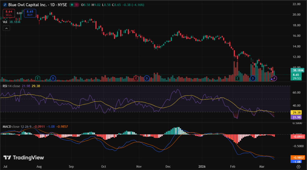 OWL stock closed at $9.00 using last market data on March 11, 2026. It dropped 4.86% that day from $9.46 prior close. Five-day trend fell sharply from $10 levels, down over 10%. One-month performance plunged 28% from early March highs near $12.50.