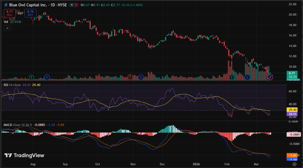 OWL stock ranged $8.50 low to $9.02 high March 12, 2026 closing near $8.58 using last market data from Nasdaq. Volume hit 51.07 million versus 41.35 million average. Five-day trend down from $10.42 March 4 peak, off 18%.