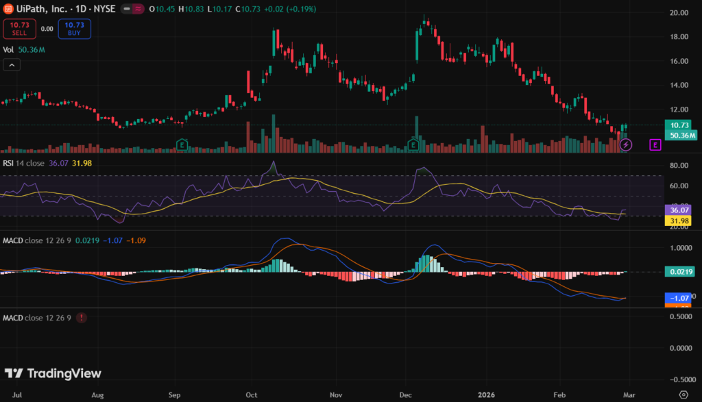 PATH closed $12.48 Friday, after hours $10.73 up 0.14%. Volume 50M above avg 30M. Day low $10.17 high $10.83.
