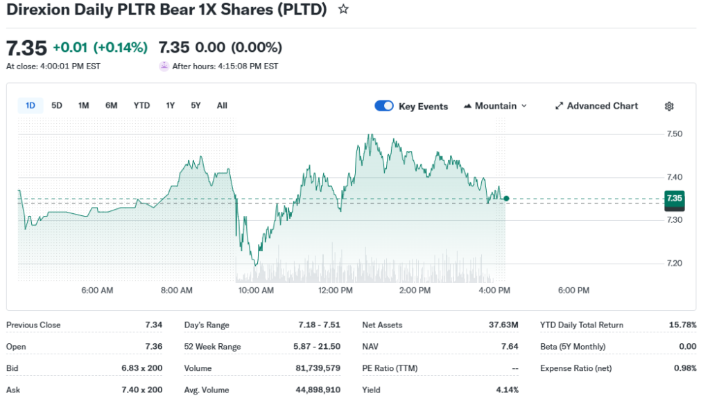 The PLTD ETF tracks the inverse daily performance of Palantir Technologies (PLTR) stock, aiming for -1x returns.
