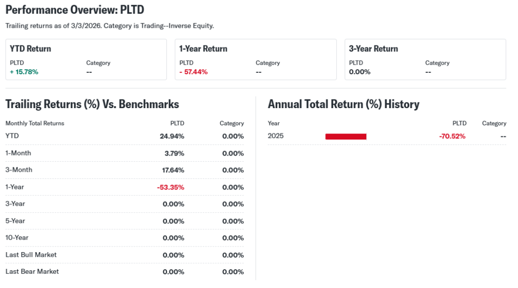 PLTD reports no direct earnings; performance mirrors inverse PLTR results.