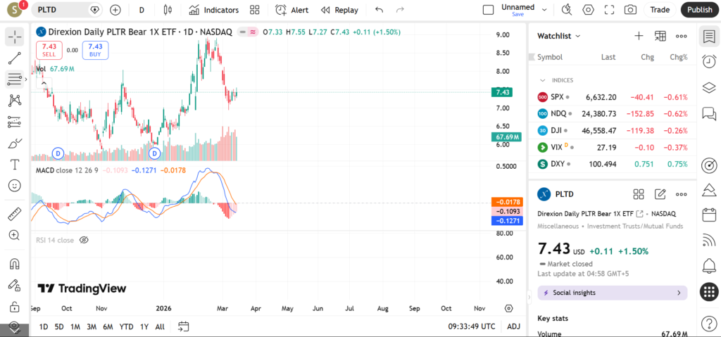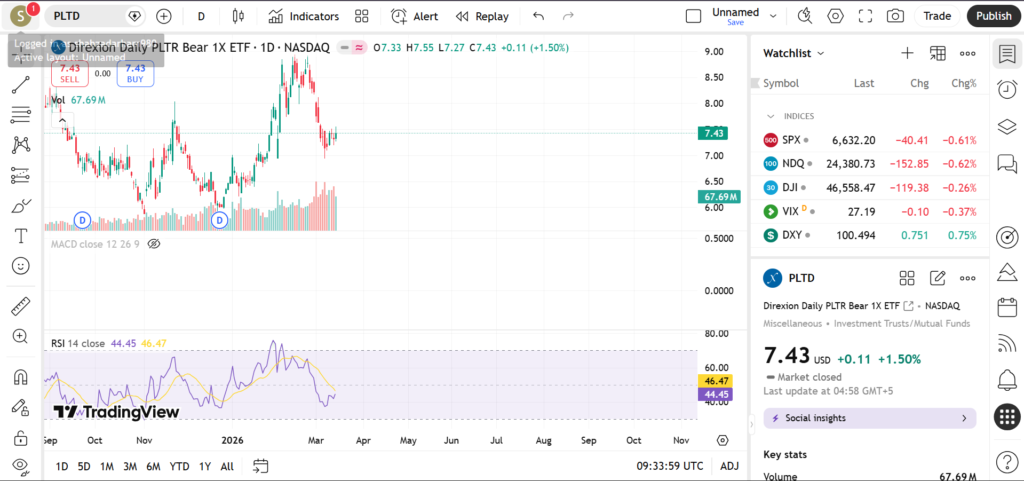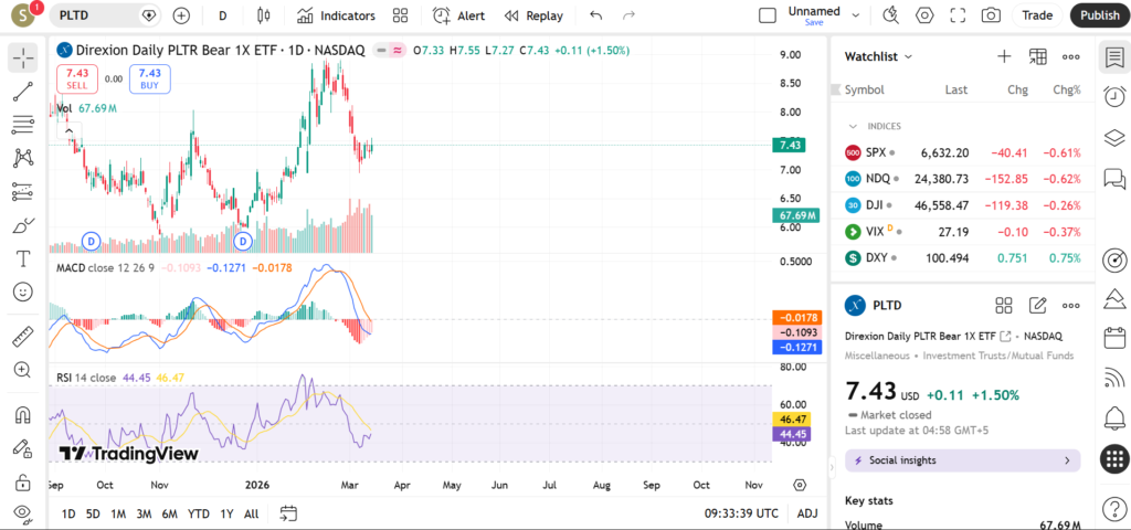 In March 2026, PLTD draws attention amid PLTR’s post-earnings volatility and AI sector rotations, with the bear ETF experiencing sharp swings tied to its underlying. This detailed analysis explores the short-term price trend, essential support and resistance levels, RSI/MACD signals, volume dynamics, and a pragmatic outlook to help retail traders navigate this leveraged instrument educationally.