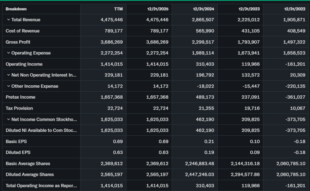 Business model scales via AI platforms. Industry grows 30% yearly; PLTR leads gov AI. Financials solid, cash funds buys.