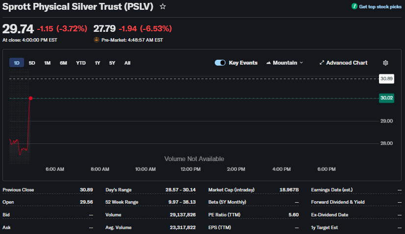 PSLV ETF closed at $17.84 on the last trading day. It fell from $18.07, down about 1.3% in one day.