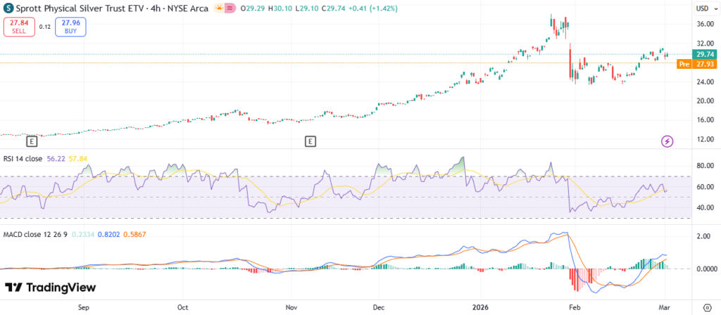 The 50-day moving average hovers around $26-29, but recent data shows trading above key supports. The 200-day average is $17.70; PSLV ETF trades near it now. No golden cross (50-day over 200-day bullish) or death cross seen lately.