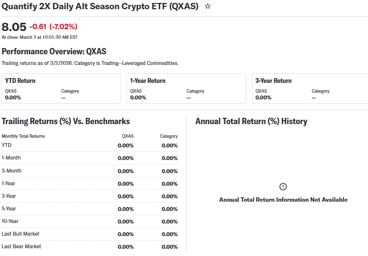 QXAS ETF tracks twice the daily performance of altcoin infrastructure assets like Solana staking and XRP swaps, beyond Bitcoin.