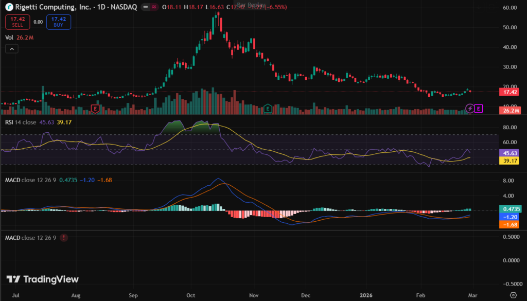 RGTI stock closed at $17.30 on the last market session. It fell 6% that day amid high volume of 26 million shares.