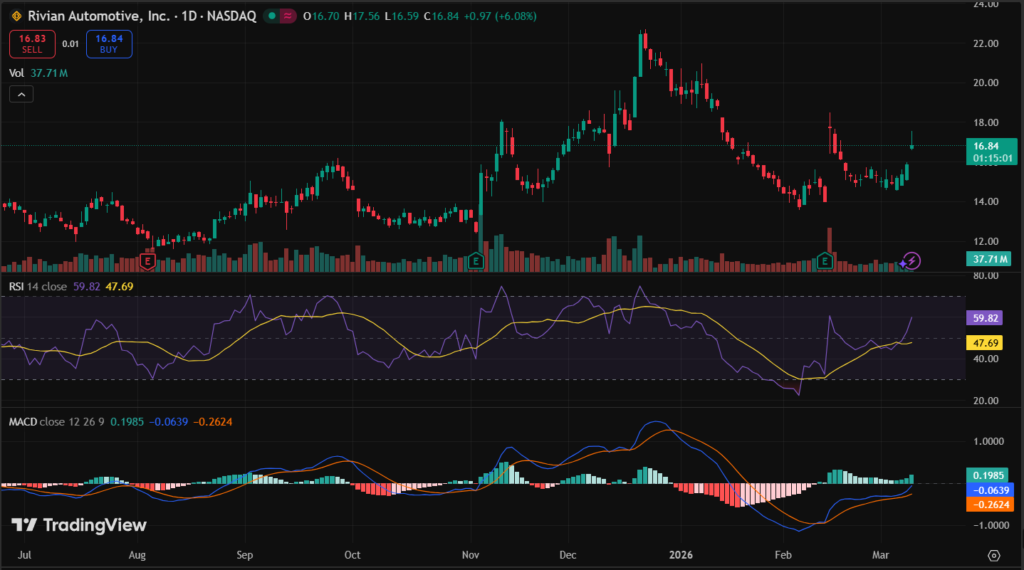 RIVN stock closed at $16.98 on March 10, 2026, per last market data, up from $15.87 prior. Daily range hit $17.56 high, $15.80 low.