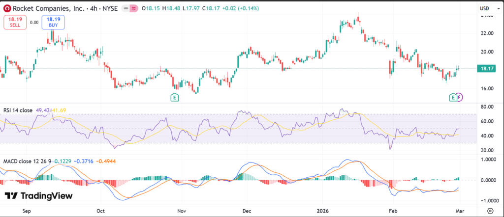 RKT stock closed at $18.21 on February 26, 2026, after jumping 2.65% on earnings. It rose 8% in after-hours on Q4 results. Over five days, shares climbed amid mortgage volume gains. The one-month trend shows gains from rate cuts.