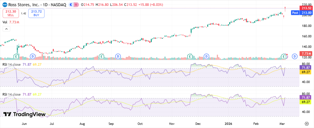 ROST stock closed at around $137 on recent trading days, per last market data. It gained sharply post-Q4 earnings on March 3, 2026, leading gainers amid upbeat guidance. One-day performance surged on sales beats; five-day trend turned positive after tariff concerns eased.