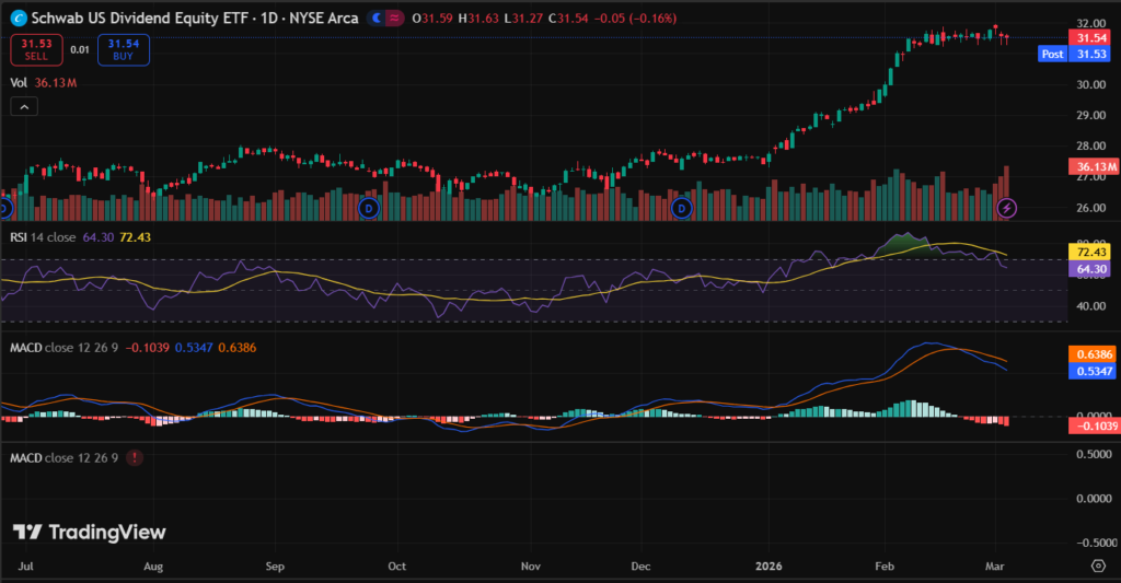 Last market close March 3, 2026 showed SCHD ETF around $27.32. Mild gains track broader indices. Recent trading stayed range-bound.