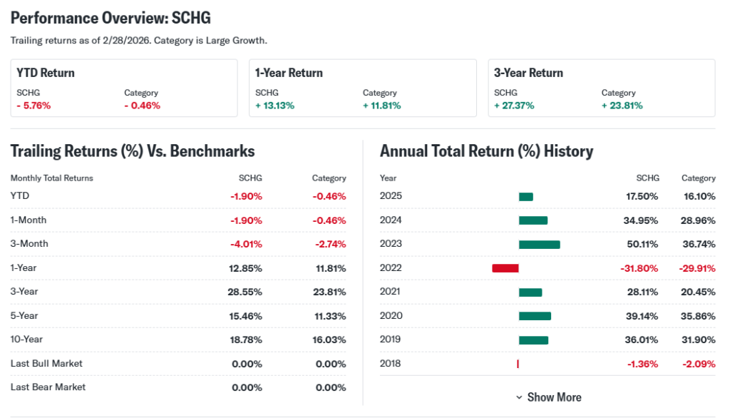 SCHG ETF closed at $30.96 on February 27, 2026, per last market data. It saw a 0.85% gain that day amid market recovery.