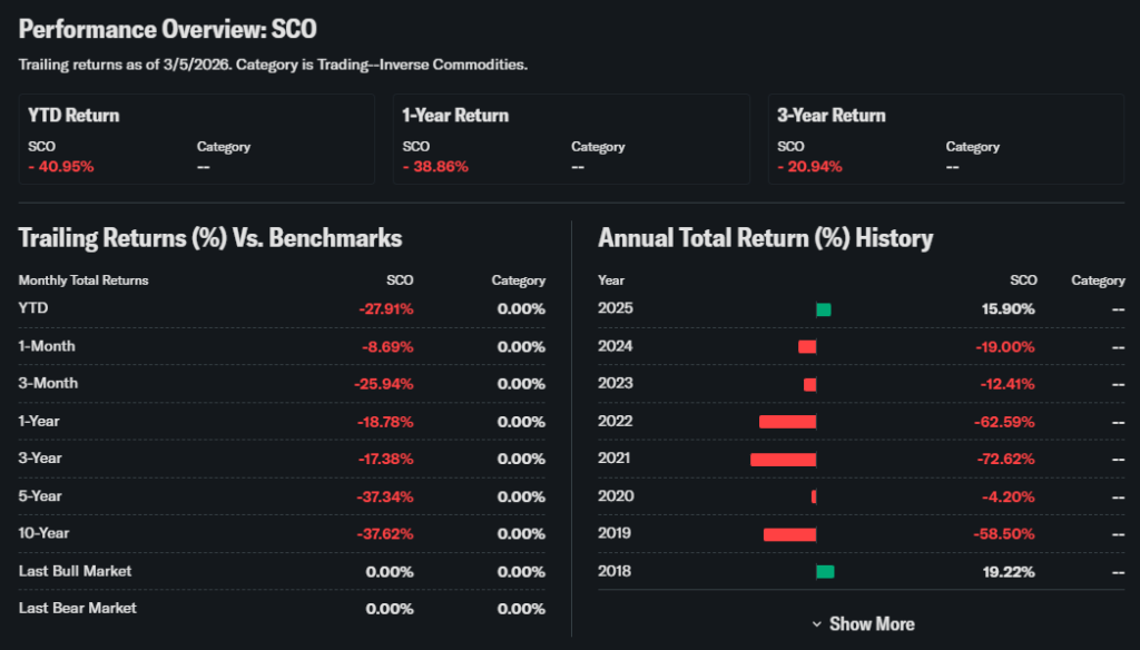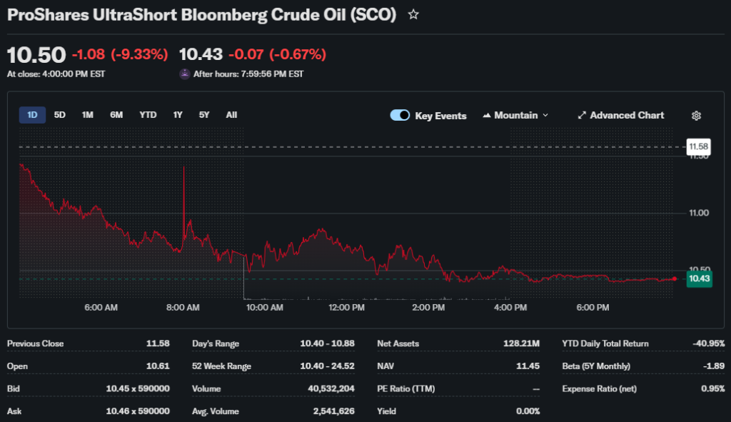 As of the last market close on March 6, 2026, SCO ETF traded at $10.51, up 0.96% for the day. It gained ground after hitting a 1-month low of $10.40 that day. Over five days, it fell sharply amid oil’s rally, dropping about 9% from recent peaks.