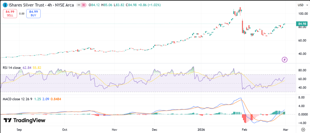 RSI at 90+ signals overbought conditions, meaning the SLV ETF price may cool soon as it measures momentum on a 0-100 scale. MACD shows bullish trend at 2.61, with line above signal for buy signals.