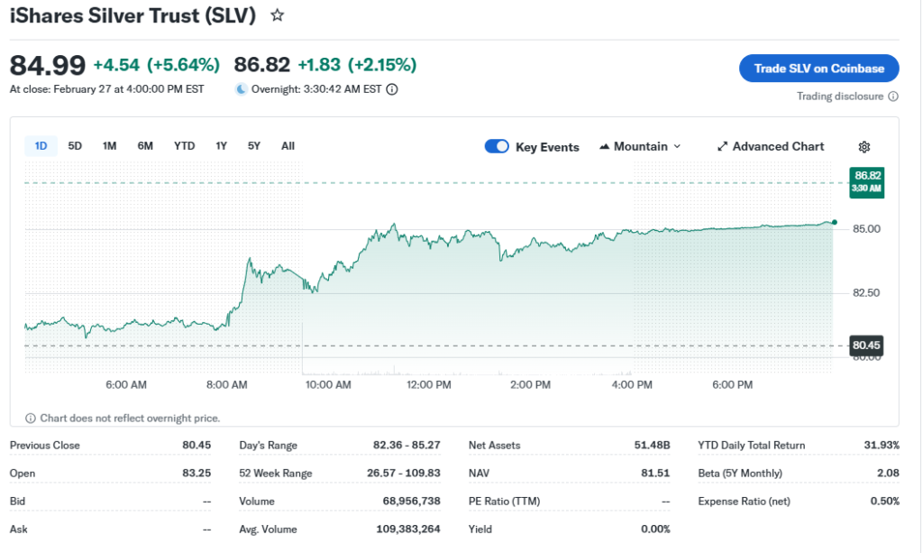 SLV ETF closed around $85 recently after strong gains, with a 52-week low of $24.25 and high near $35.91 earlier, but recent data shows peaks over $109 before a pullback to around $85. Year-to-date, SLV ETF price rose about 32%, with 6-month gains over 95% and yearly up 179% in some metrics.