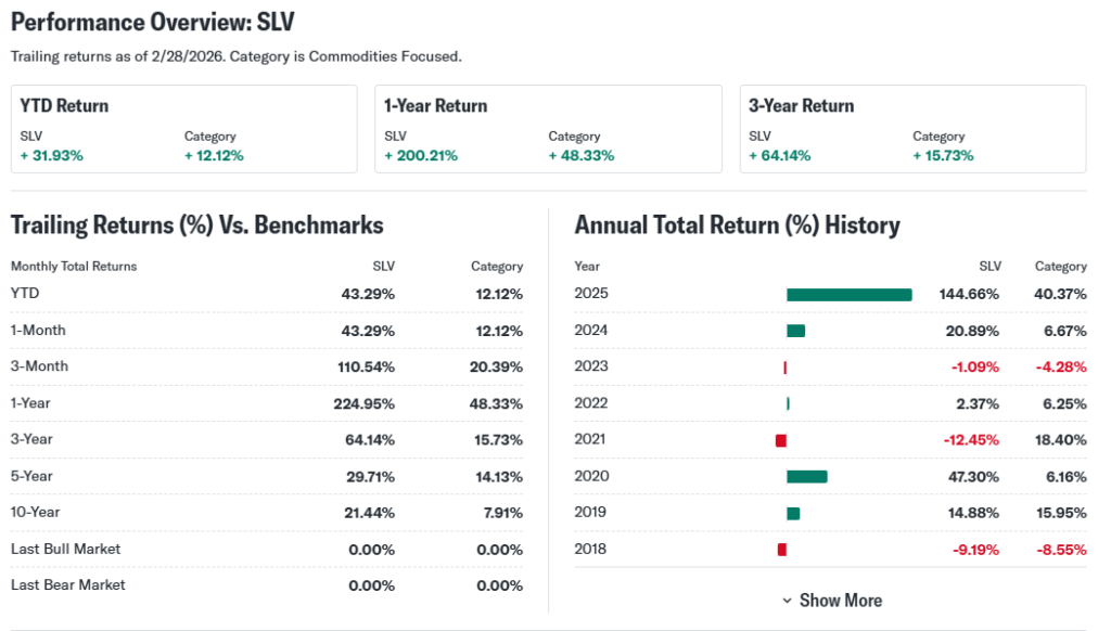 SLV ETF reports no quarterly earnings, but NAV reflects silver holdings audited regularly. Performance beat expectations with 179% 1-year return vs category ranks.