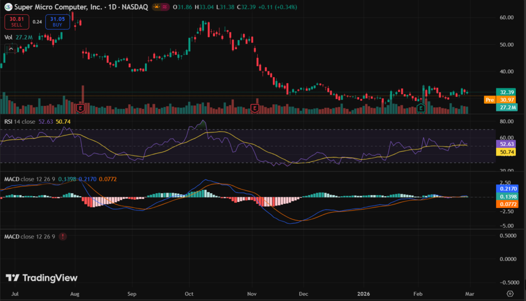 SMCI stock closed at $32.39 on February 27, 2026, up 0.34% that day.