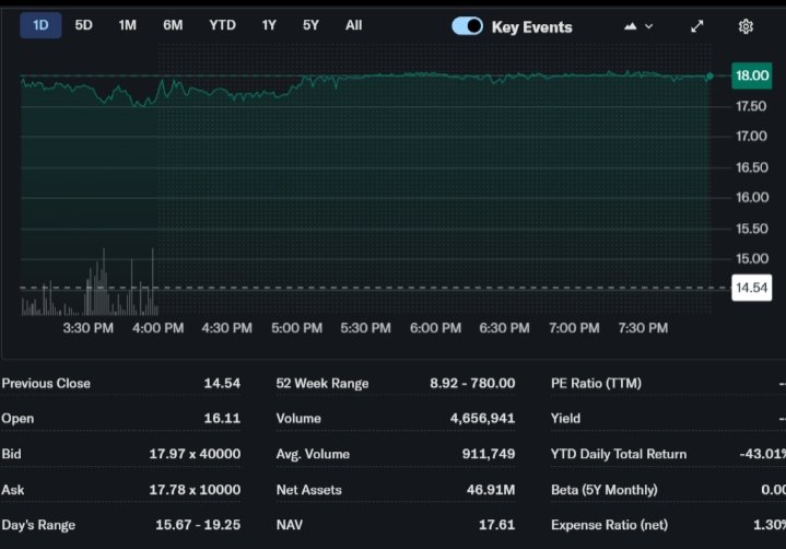 The SMU ETF closed at $17.92 on April 18, 2026, after trading between $15.06 and $19.25. One-day performance rose 19% from the prior close, reflecting strong intraday momentum.