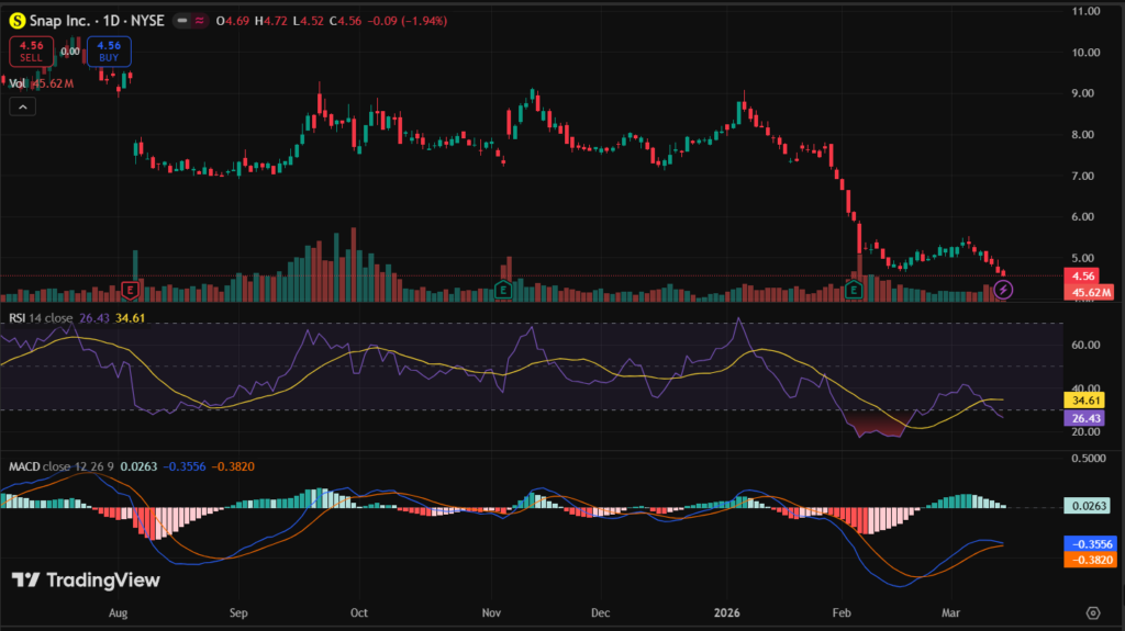 Six-month performance lags at -8%, and year-to-date SNAP stock declined 12% as of March 2026. It trades near its 52-week low of $9.50, far from the high of $16.20. This bearish trend warns investors of fading momentum and potential further pullbacks if support fails.