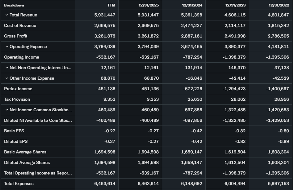 Trailing P/E negative on losses, forward P/E 45. Price-to-sales 2.4x with 10% YoY revenue to $5.36 billion. EPS loss narrows 20%.