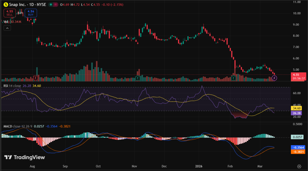 SNAP stock closed at $5.16 on March 6, 2026, based on last market data from Nasdaq. It gained 2.38% that day after $5.25 open. Five-day trend flat around $5.25 average.