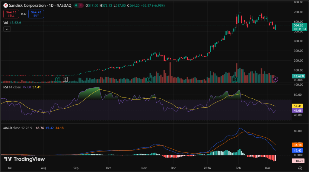 SNDK stock closed at $527.33 on March 6, 2026, per last market data. It dropped 17% in March so far after February gains. Daily range hit $526.60 low that month.