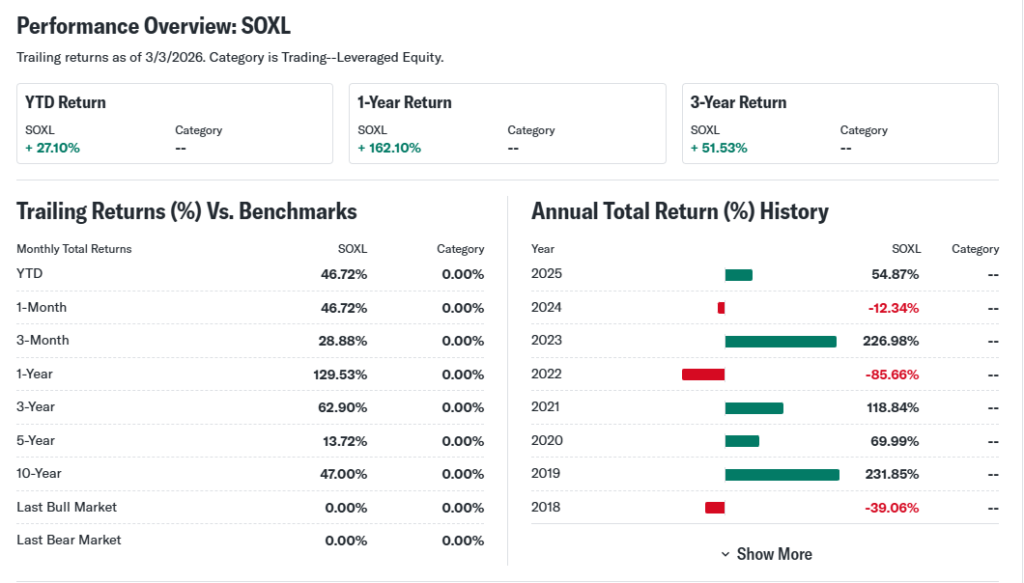 Year‑to‑date performance for the SOXL ETF typically mirrors the cyclical nature of semiconductors: strong rallies when investors price in higher chip demand, and corrections when growth expectations cool. The 52‑week high and 52‑week low in SOXL are usually far apart because a 3x structure compounds volatility. For many investors, the overall trend can look bullish during sustained chip rallies, but day‑to‑day risk is high.