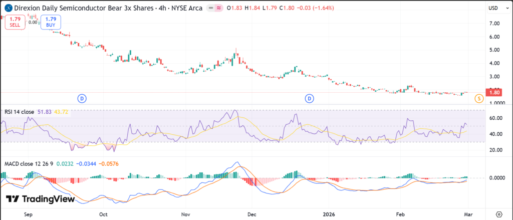 SOXS ETF closed at $1.79 after hours on February 27, 2026, up 4.07% from $1.72. Volume hit 724 million shares, above average 466 million.