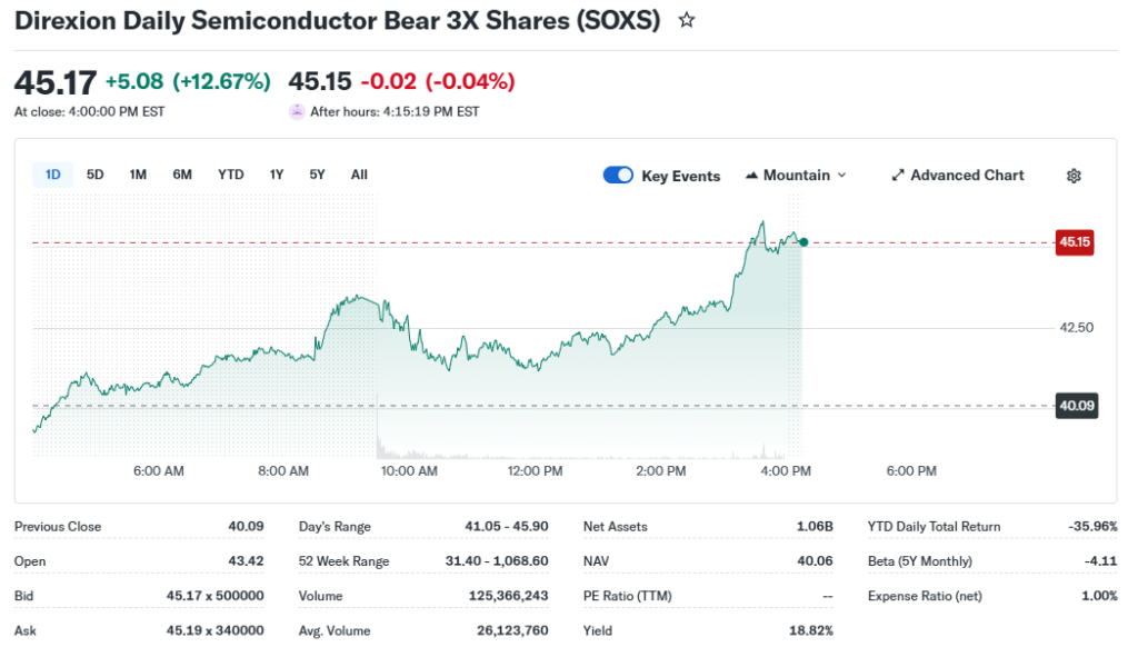 AI hype crushes SOXS ETF performance, down big YTD historically (-92% 1-year).