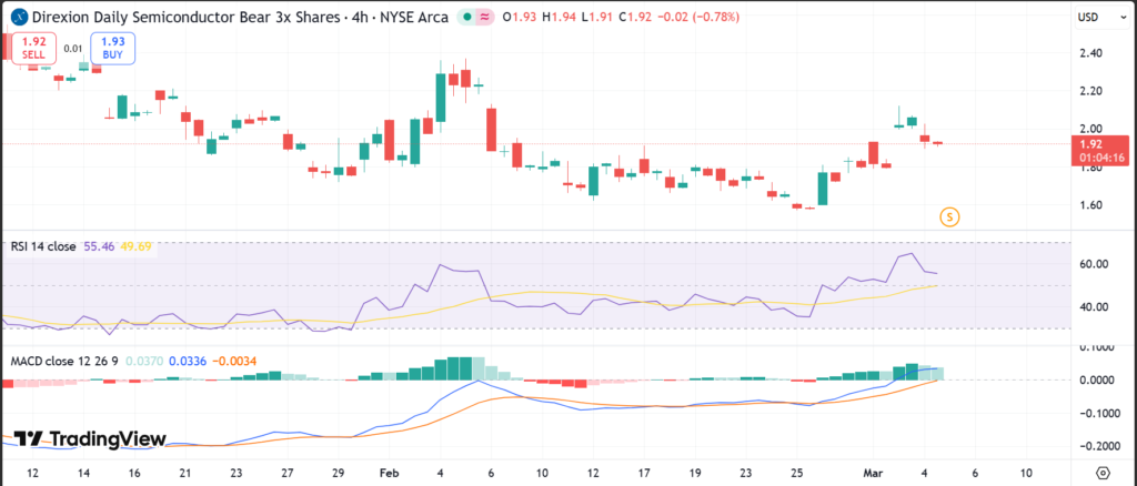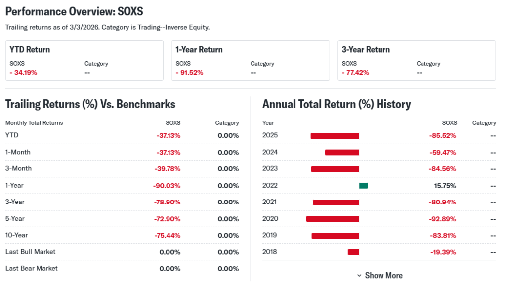 At last market close on March 4, 2026, SOXS ETF traded around $3.41, down sharply year-to-date by about 34%.