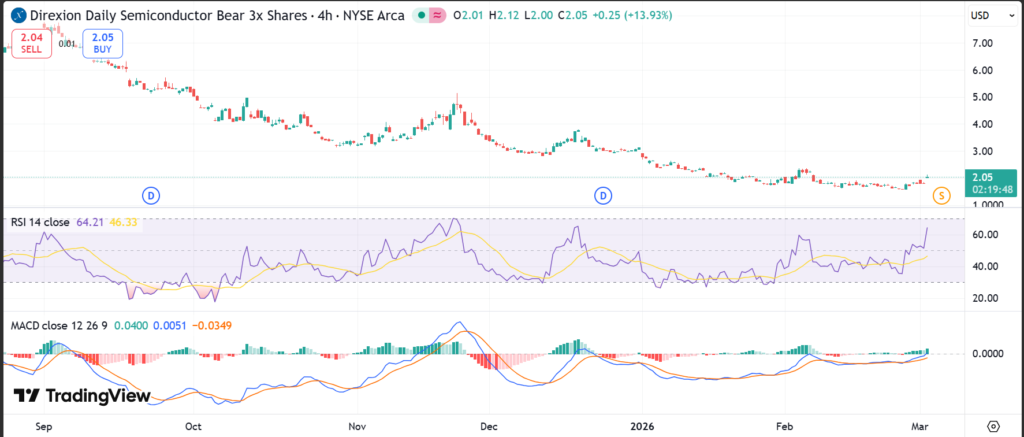 Technical analysis for SOXS ETF technical analysis focuses on short‑term swings because of its 3x daily leverage and daily reset structure. On the recent chart, support levels are around the recent lows near $1.80–2.00, the area where buyers have stepped in after the split‑adjusted collapse. A clear resistance zone appears above $2.50–3.00, where earlier selling pressure has capped rallies.