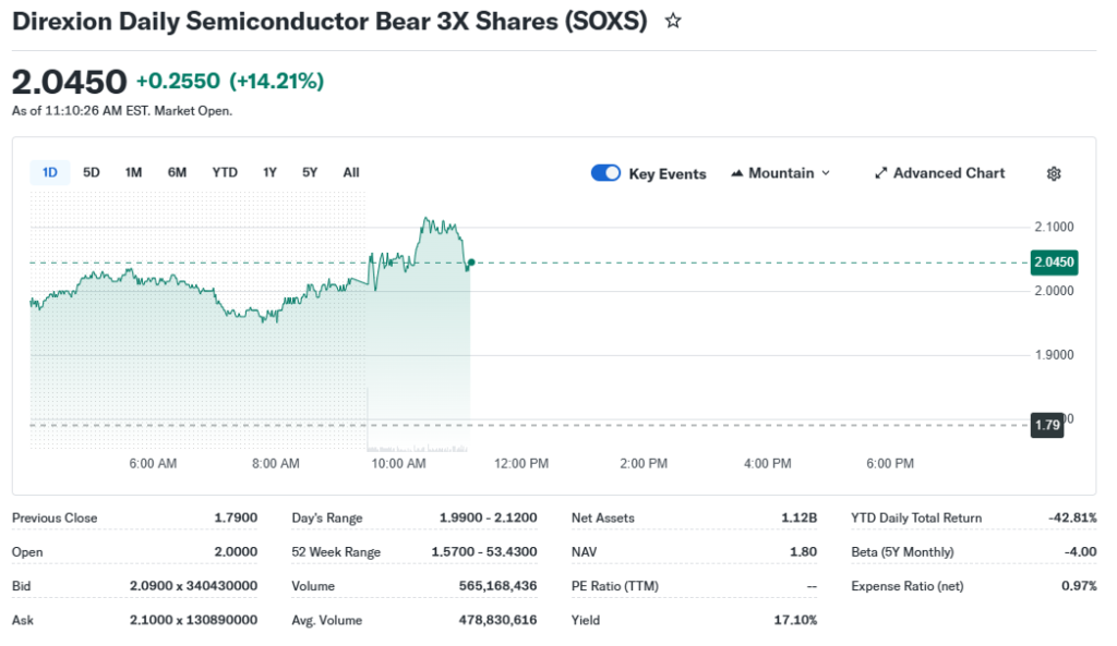 SOXS does not report SOXS earnings like a company. Instead, its performance is driven by the quarterly results of semiconductor leaders such as NVIDIA (NVDA), AMD, Broadcom, and Intel, which dominate the SOX index. When these companies post strong earnings and raise guidance, the SOX index rallies, and SOXS falls sharply.
