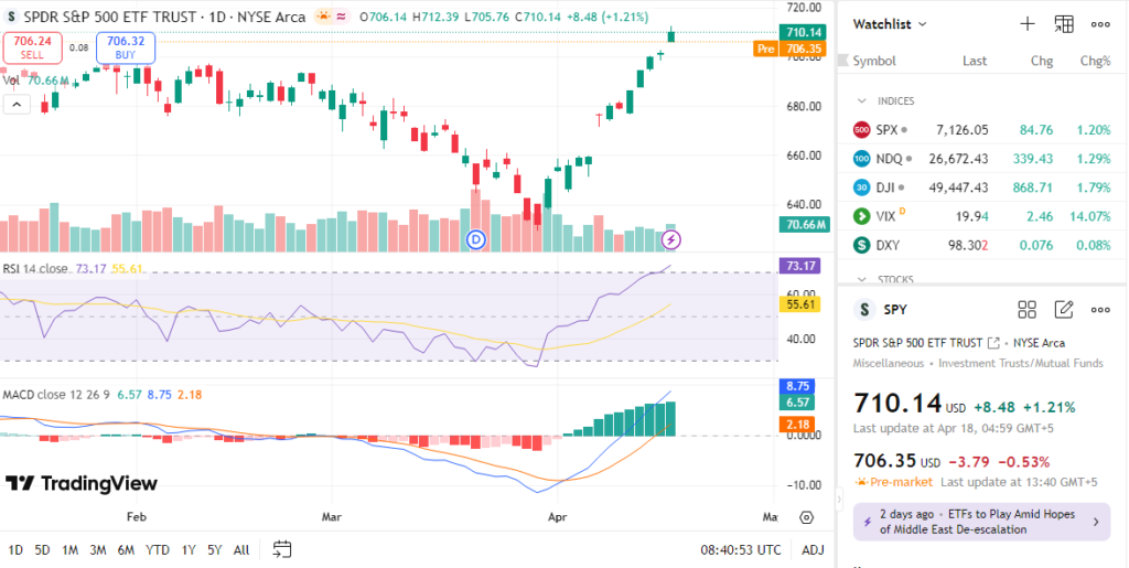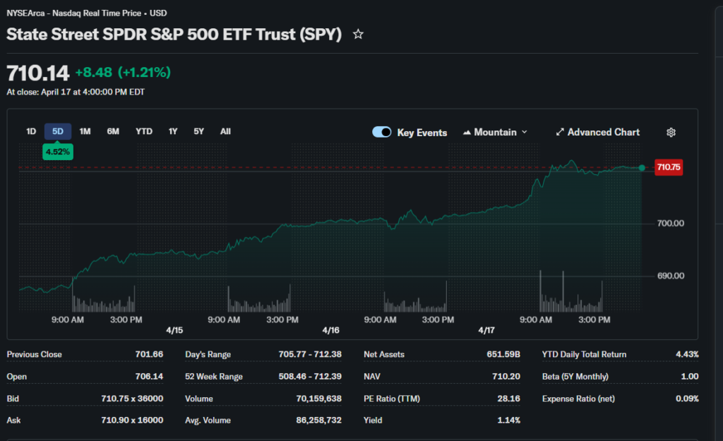SPY ETF closed at $710.14 on April 16, 2026. This marks the last market session’s end.