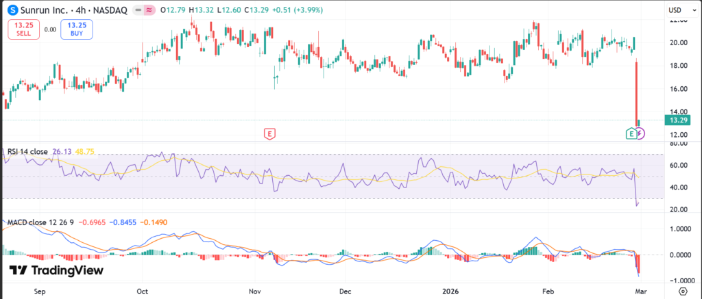 RUN stock closed at $13.08 on February 28, 2026, after trading between $12.47 and $20.52. Volume hit 56.46 million shares, far above the average of 12.85 million.