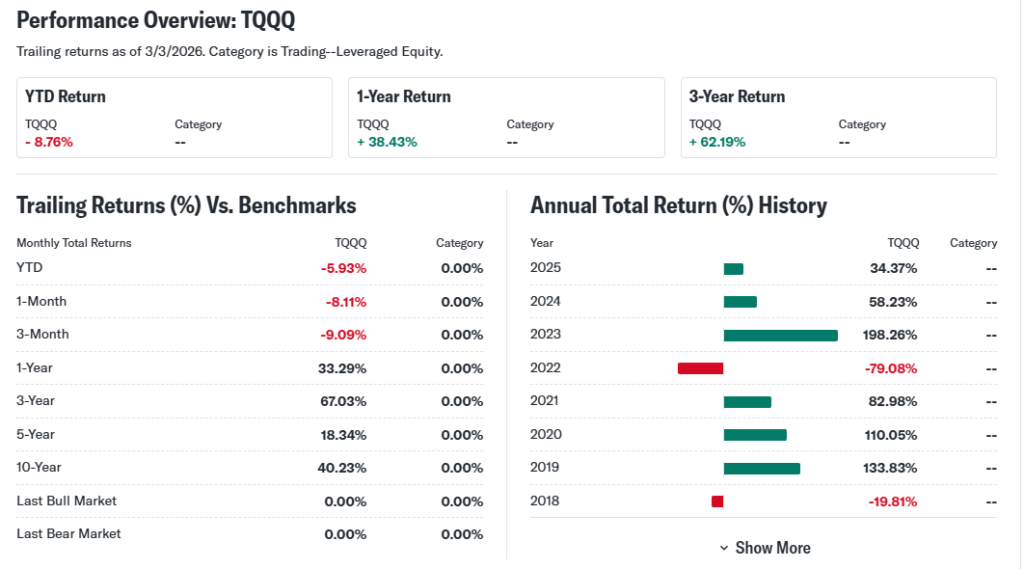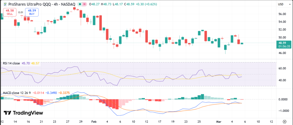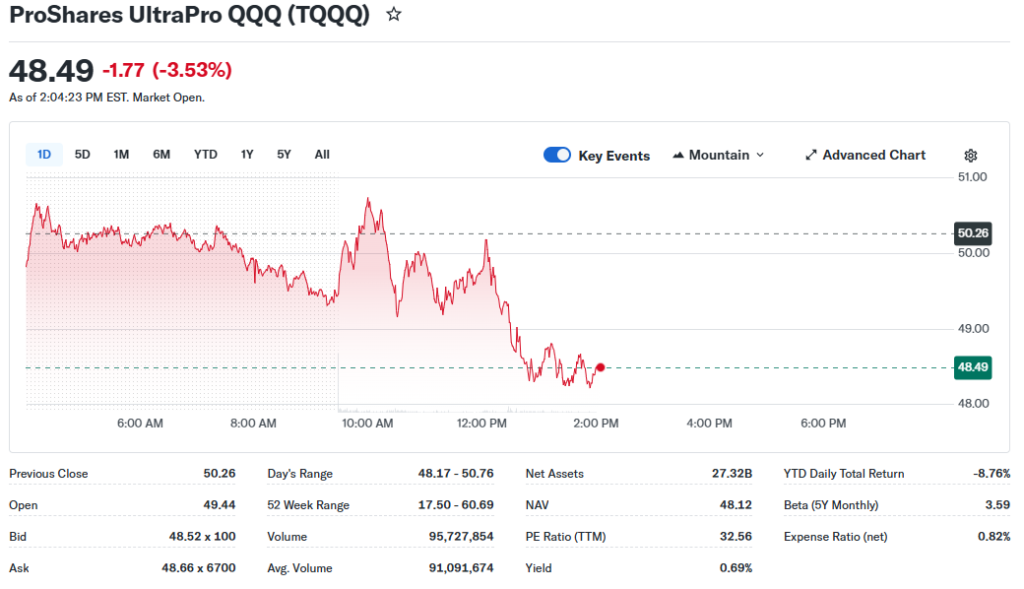 As of the last market close on March 4, 2026, TQQQ ETF price stood at $50.14, down 0.24% for the day. The 1-day performance showed a slight dip after intraday highs near $50.79.