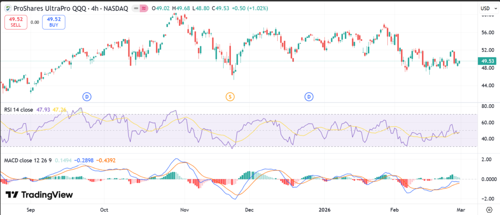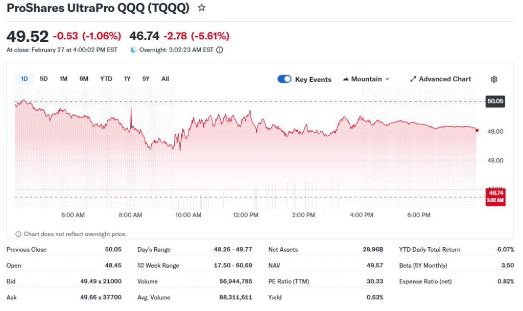 TQQQ ETF closed at $49.52 on February 27, 2026, down from $50.05 prior. The day’s range hit 48.26 to 49.77.